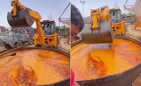ഒരു ഭീമൻ ദാൽ മഖാനി പാത്രം ജെസിബി മെഷീൻ ഉപയോഗിച്ച് ഇളക്കുന്നതിന്റെ കൗതുകകരമായ ദൃശ്യങ്ങൾ സോഷ്യൽ മീഡിയയിൽ പങ്കുവയ്ക്കപ്പെട്ടു(giant bowl of dal makhani). സോഷ്യൽ മീഡിയാ പ്ലാറ്റ് ഫോമായ എക്സിൽ @sarcastic_us എന്ന ഹാൻഡിലാണ് ദൃശ്യങ്ങൾ പങ്കുവച്ചത്.