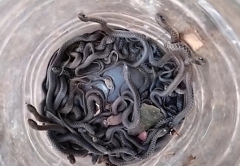 അത് ഉയർത്താൻ ശ്രമിക്കുന്നതിനിടയിൽ, ഒരു പാമ്പ് പുറത്തേക്ക് പോയത്രേ. പിന്നീട് ഡ്രം പരിശോധിച്ചപ്പോഴാണ് ഏകദേശം 100 പാമ്പുകൾ അവിടെ ചുരുണ്ടുകൂടി കിടക്കുന്നത് കണ്ടത്. ഭയന്നുപോയ അയാൾ ഉടൻ തന്നെ ഗ്രാമവാസികളെ സഹായത്തിനായി വിളിച്ചു. ഒപ്പം പാമ്പ് പിടുത്തക്കാരനെയും വിവരമറിയിക്കുകയായിരുന്നു. പാമ്പ് പിടിത്തക്കാരൻ ഈ പാമ്പുകളെ ഇവിടെ നിന്നും പിടിച്ച് കാറ്റിൽ തുറന്നു വിട്ടു.