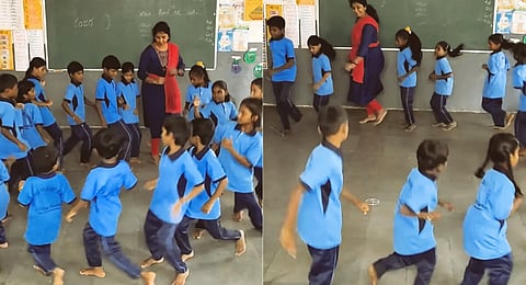 ദൃശ്യങ്ങളിൽ, അധ്യാപിക തന്റെ വിദ്യാർത്ഥികളുമായി ഓരോ ചുവടും കൃത്യമായി വയ്ക്കുന്നത് കാണാം. അവരുടെ ഭംഗിയുള്ള നീക്കങ്ങളും ഊർജ്ജസ്വലമായ പങ്കാളിത്തവും കുട്ടികളുടെ ആവേശം എടുത്തുകാണിക്കുന്നുണ്ട്.