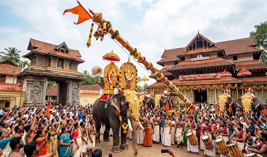Story Summary: The world-famous Thrissur Pooram has officially begun with the flag-hoisting ceremony at Thiruvambady and Paramekkavu temples. The main events, including the grand fireworks display, Ilanjithara Melam, and Kudamattom, will take place on April 26. Thrikkadavoor Shivaraju will carry the idol of Paramekkavu Bhagavathy this year.