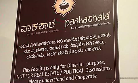 "ഈ സൗകര്യം റിയൽ എസ്റ്റേറ്റ്/രാഷ്ട്രീയ ചർച്ചകൾക്കുള്ളതല്ല, ഭക്ഷണം കഴിക്കാൻ മാത്രമുള്ളതാണ്. ദയവായി മനസിലാക്കി സഹകരിക്കുക." എന്നെഴുതിയ ബോർഡ്ന്റെ ഫോട്ടോ ഒരു എക്സ് ഉപയോക്താവ് പങ്കുവെച്ചു. ബെംഗളൂരുവിലെ റെസ്റ്റോറന്റുകളിൽ, പലരും ദീർഘനേര ചർച്ചകൾ നടത്തുകയും വളരെ കുറച്ച് ഭക്ഷണം മാത്രം ഓർഡർ ചെയ്യുകയും ചെയ്യുമെന്നും അതിനാൽ ഇത്തരം മുന്നറിയിപ്പുകൾ അവിടെ സാധാരണമാണെന്നുമാണ് പലരും പറയുന്നത്.